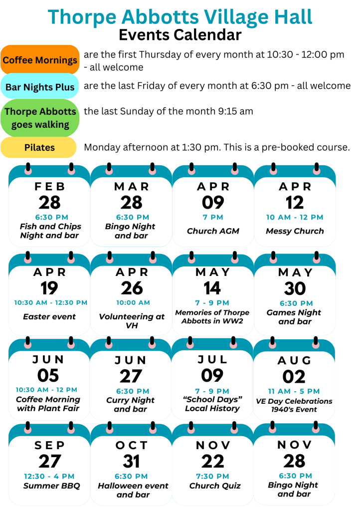 What’s happening locally Dates of forthcoming events Saturday 6th December, Christmas lights will be switched on outside the village hall. Events at the Waverney Heritage Centre 2025 here Home